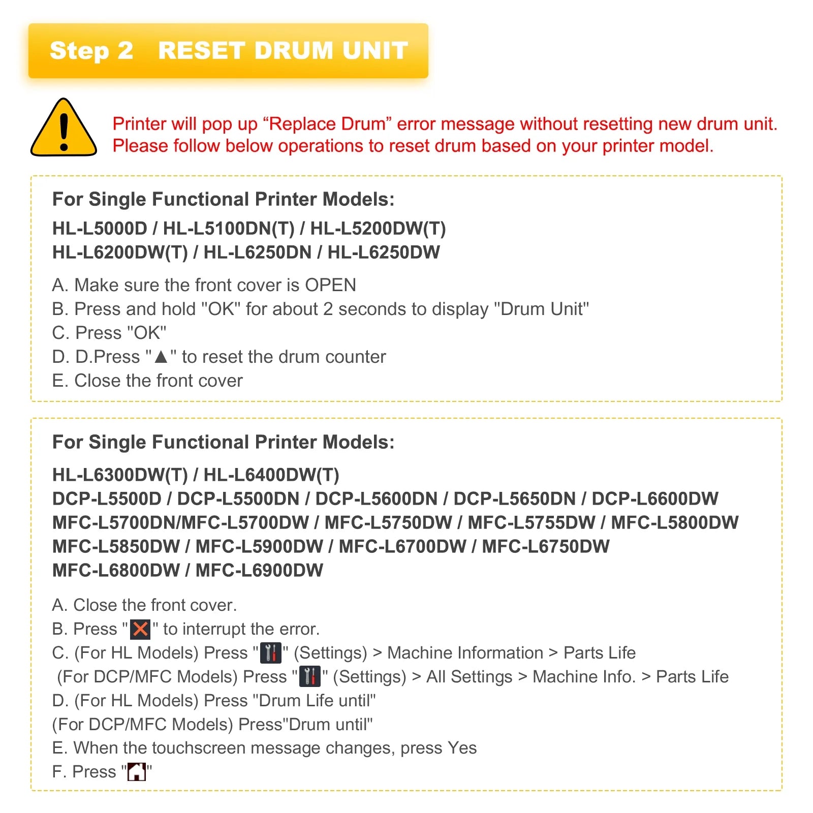 - Compatible for Brother Printer: HL-L5000D, HL-L5100DN, HL-L5200DW, HL-L5200DWT; HL-L6200DW, HL-L6200DWT, HL-L6250DW, HL-L6300DW, HL-L6400DW, HL-L6400DWT; MFC-L5700DW, MFC-L5800DW, MFC-L5850DW, MFC-L5900DW, MFC-L6700DW, MFC-L6750DW, MFC-L6800DW, MFC-L6900DW; DCP-L5500DN, DCP-L5600DN, DCP-L5650DN